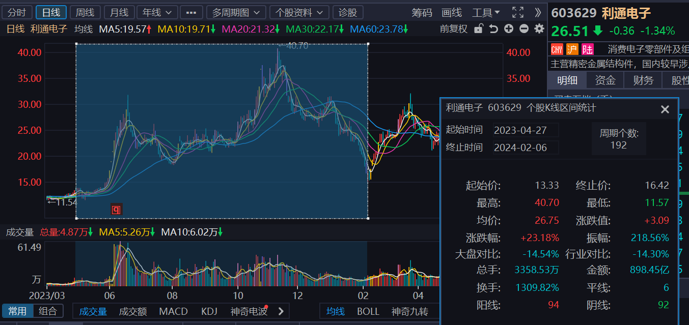 在2023年12月21日至2024年1月2日,8个交易日累计上涨16.72%,但在随后约1个月时间股价腰斩,自2024年1月3日至2月6日,利通电子25个交易日累计下跌46.9%。