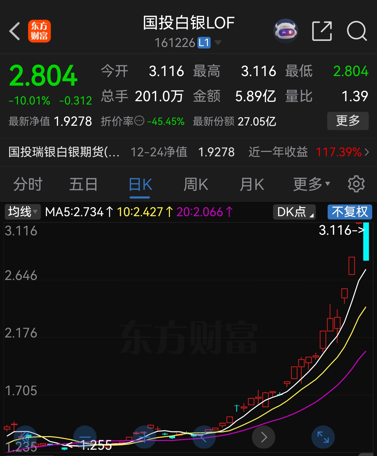 今日复牌后,国投白银LOF未能延续此前涨势,快速触及跌停,截至10:42,成交金额已超5亿元。