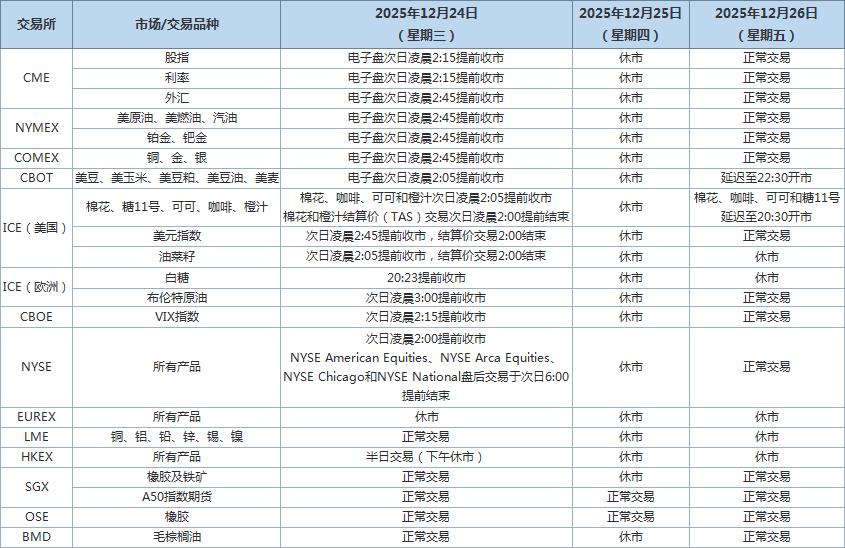12月25日(周四)适逢美国圣诞节假期,金融市场交易时间有所调整。