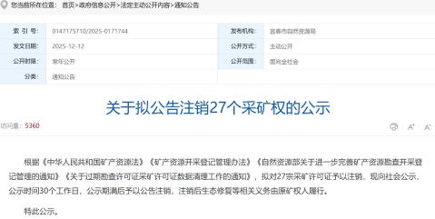 12月12日,宜春市自然资源局网站信息公开显示,根据《中华人民共和 国矿产资源法》《矿产资源开采登记管理办法》《自然资源部关于进一步完善矿产资源勘查开采登记管理的通知》《关于过期勘查许可证采矿许可证数据清理工作的通知》,拟对27宗采矿许可证予以注销,现向社会公示,公示时间30个工作日,公示期满后予以公告注销,注销后生态修复等相关义务由原矿权人履行。
