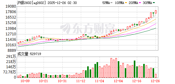 12月25日晚间,贵金属期货走强,沪银夜盘涨超18000元/千克,创历史新高,当前涨幅接近5%。