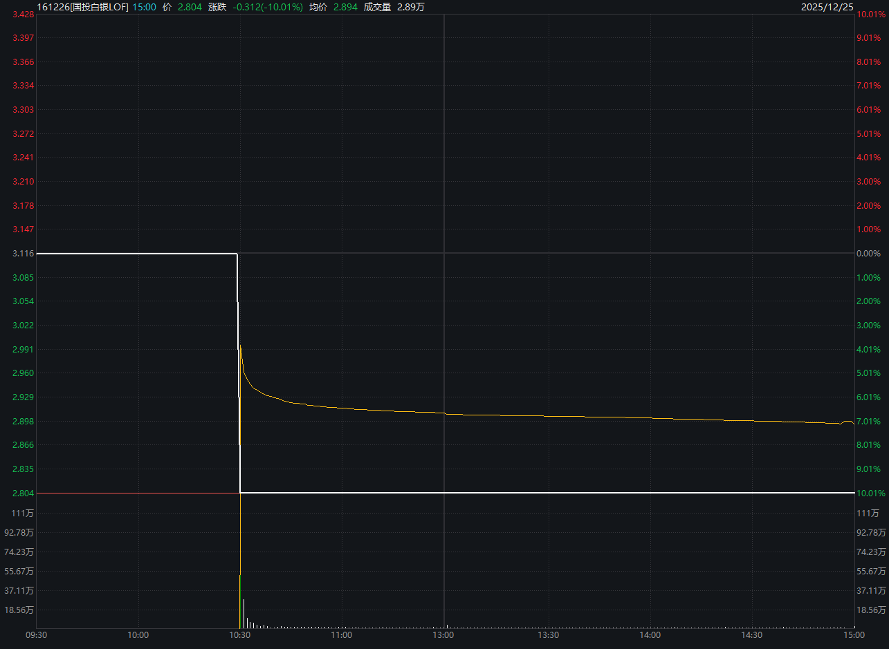 12月25日,国投白银LOF复牌后应声跌停,超13亿元卖盘高悬,终结其三连板涨停表现;国投瑞盈LOF、国泰商品LOF等多只产品盘中陆续跌停。这与前一日逾19只LOF集体涨停的狂热场面形成鲜明对照。