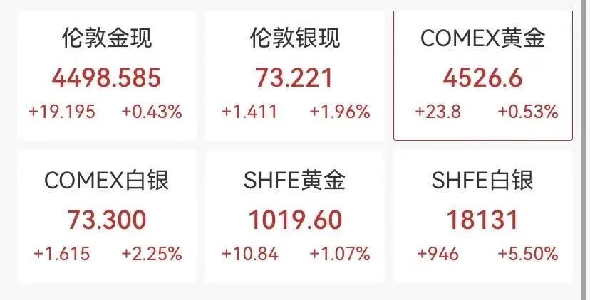 现货黄金逼近4500美元/盎司,现货白银跳空高开,突破73美元/盎司,再创历史新高,年内涨幅已超150%。现货铂金日内近5%,截至7:48,报2337.6美元/盎司。