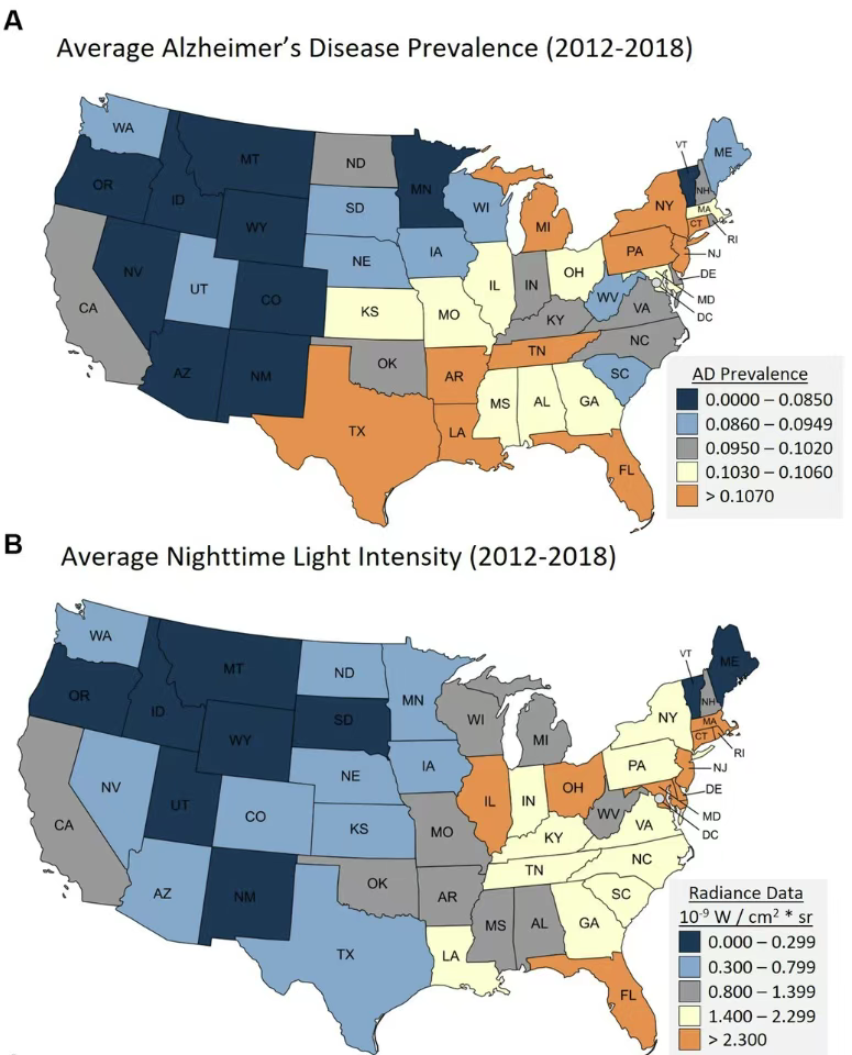 这项研究的科研人员把美国48个州的光污染情况和本地区的医疗记录进行了比对,令人惊讶的是,他们竟然发现光污染和阿尔兹海默症之间存在显著正相关,这种巧合也引起了科研人员的兴趣。