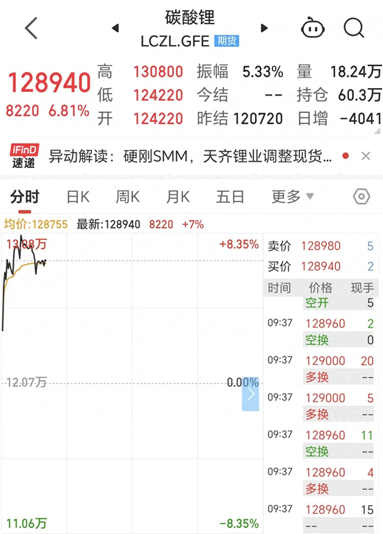 截至发稿时,碳酸锂主力合约报128940元/吨,涨幅6.81%。中新经纬注意到,碳酸锂期货主力合约此前已连续5个交易日飘红。