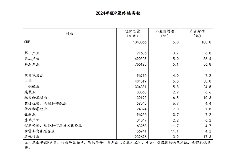 经最终核实,2024年,GDP现价总量为1348066亿元,比初步核算数减少1018亿元;按不变价格计算,比上年增长5.0%,与初步核算数持平。三次产业和各行业数据见附表。