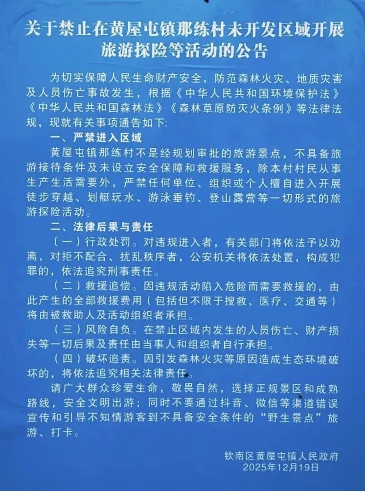 为保障群众安全,黄屋屯镇政府于12月19日发布公告,明确该区域并非规划开发的旅游景点,除本村村民生产生活需要外,严禁任何人进入进行旅游、探险等活动。镇政府与村委会已安排人员现场劝导,近日前来打卡的游客已明显减少。