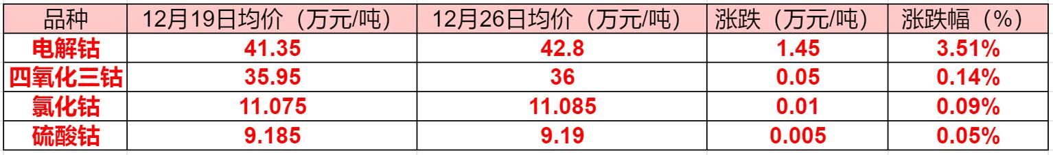 截至12月26日,钴中间品(CIF中国)现货报价上涨0.03美元/磅,报24.75~25美元/磅,均价报24.88美元/磅,较12月19日涨幅达0.12%。