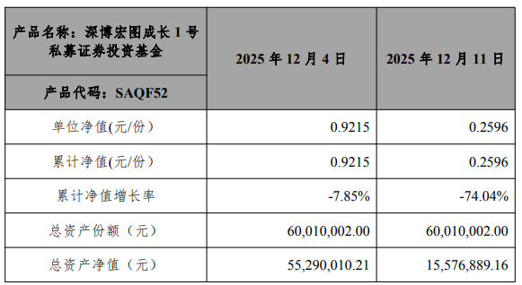 根据公告披露的数据显示,该基金截至2025年12月4日的净值为0.9215元,然而,截至2025年12月11日,基金单位净值暴跌至0.2596元,累计亏损74.04%。也就是说,该基金在圣元环保提出计划赎回基金全部份额的当周,单周净值下跌了71.83%。