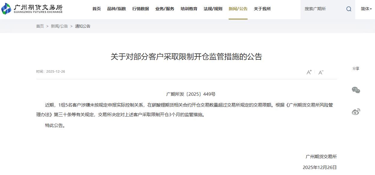 近期,1组5名客户涉嫌未按规定申报实际控制关系,在碳酸锂期货相关合约开仓交易数量超过交易所规定的交易限额。根据《广州期货交易所风险管理办法》第三十条等有关规定,交易所决定对上述客户采取限制开仓3个月的监管措施。