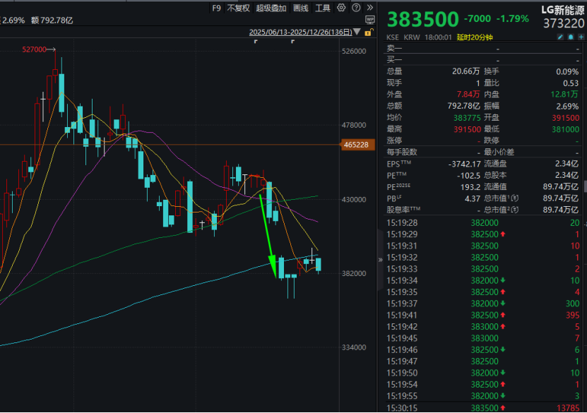 几天之前,LG新能源被福特汽车取消了规模达9.6万亿韩元的电动汽车电池供应合同,导致该公司的股价单日大跌近9%。至今,LG新能源的股价都未能收复失地。周五(12月26日),LG新能源股价下跌1.79%,市值报89.74万亿韩元(约合人民币4350亿元)。