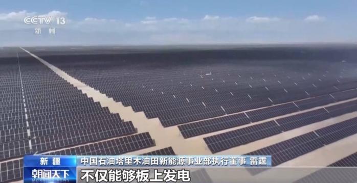 中国石油塔里木油田新能源事业部执行董事 雷霆:我们通过在流沙上建设光伏板,不仅能在板上发电,还降低了风速,营造了阴凉,在板下铺设滴灌带进行生物治沙,一举多赢。预计到明年,我们的装机将超过400万千瓦。