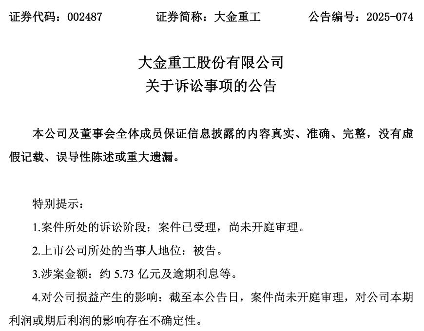 此前,公司12月18日发布公告称,因建设工程施工合同纠纷,大金重工及其三家子公司被中国葛洲坝集团电力有限责任公司告上法庭,涉案金额合计约5.73亿元。