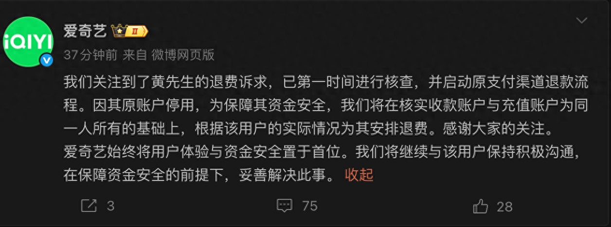 12月28日,“男子爱奇艺会员充了25年遇退费难”的话题引发广泛关注。随着事件持续发酵,爱奇艺今日通过官方微博正式回应称,我们关注到了黄先生的退费诉求,已第一时间进行核查,并启动原支付渠道退款流程。因其原账户停用,为保障其资金安全,我们将在核实收款账户与充值账户为同一人所有的基础上,根据该用户的实际情况为其安排退费。
