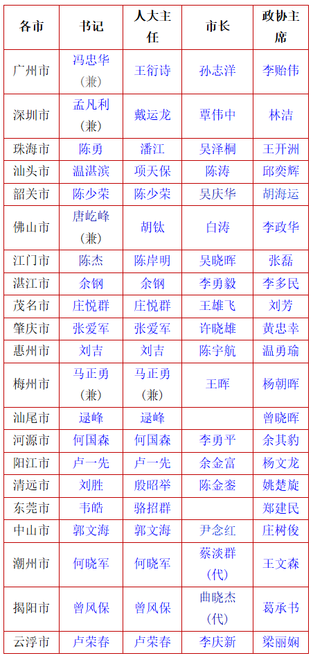 编者按:中国经济网地方党政领导人物库现将广东省所辖各地市最新市委书记、市长名单整理如下,供网友查阅。如有人事变动,本页面将及时跟进调整。如果您发现有不准确之处,请告诉我们,谢谢。纠错邮箱:yinyh@ce.cn。