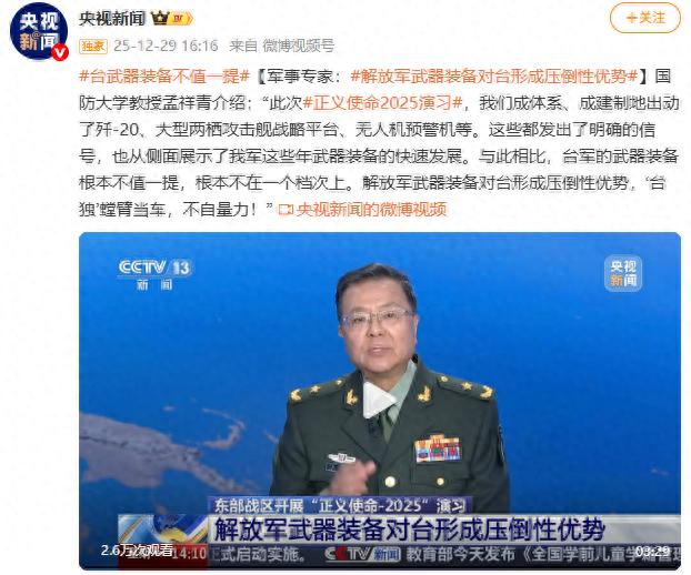 据央视新闻微博消息,国防大学教授孟祥青介绍:“此次‘正义使命-2025’演习,我们成体系、成建制地出动了歼-20、大型两栖攻击舰战略平台、无人机预警机等。这些都发出了明确的信号,也从侧面展示了我军这些年武器装备的快速发展。与此相比,台军的武器装备根本不值一提,根本不在一个档次上。解放军武器装备对台形成压倒性优势,‘台独’螳臂当车,不自量力!”