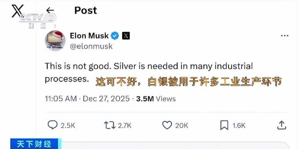 但也有分析人士认为和以往投机驱动的周期不同,支撑此轮白银涨势的不仅因为白银是贵金属里相对可负担的一种投资品,还因为它在工业领域具有不可替代性,就连马斯克也对此发声。近期,马斯克在旗下社交平台X上针对银价上涨的现象发文称:这可不好,白银被用于许多工业生产环节。