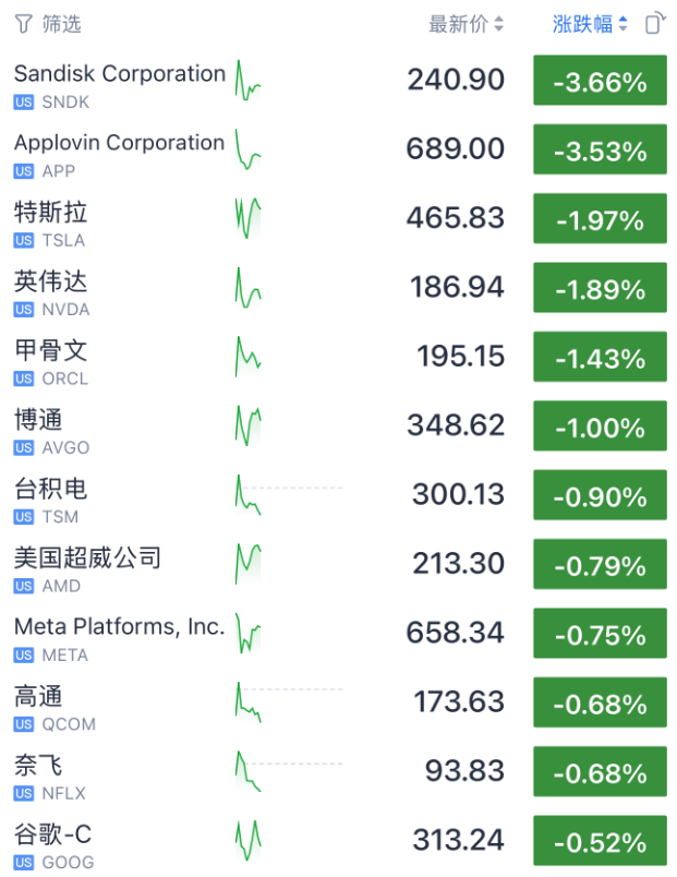 当日,“AI交易”板块承压。英伟达股价下跌接近2%,回吐了上周超过5%涨幅的一部分。