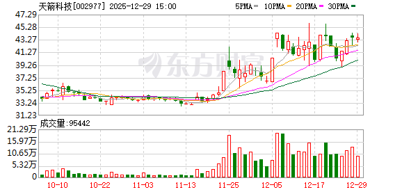 二级市场上,天箭科技股价最近4天累计上涨8.27%。截至12月29日收盘,天箭科技上涨0.09%报43.59元/股,总市值约52.36亿元。