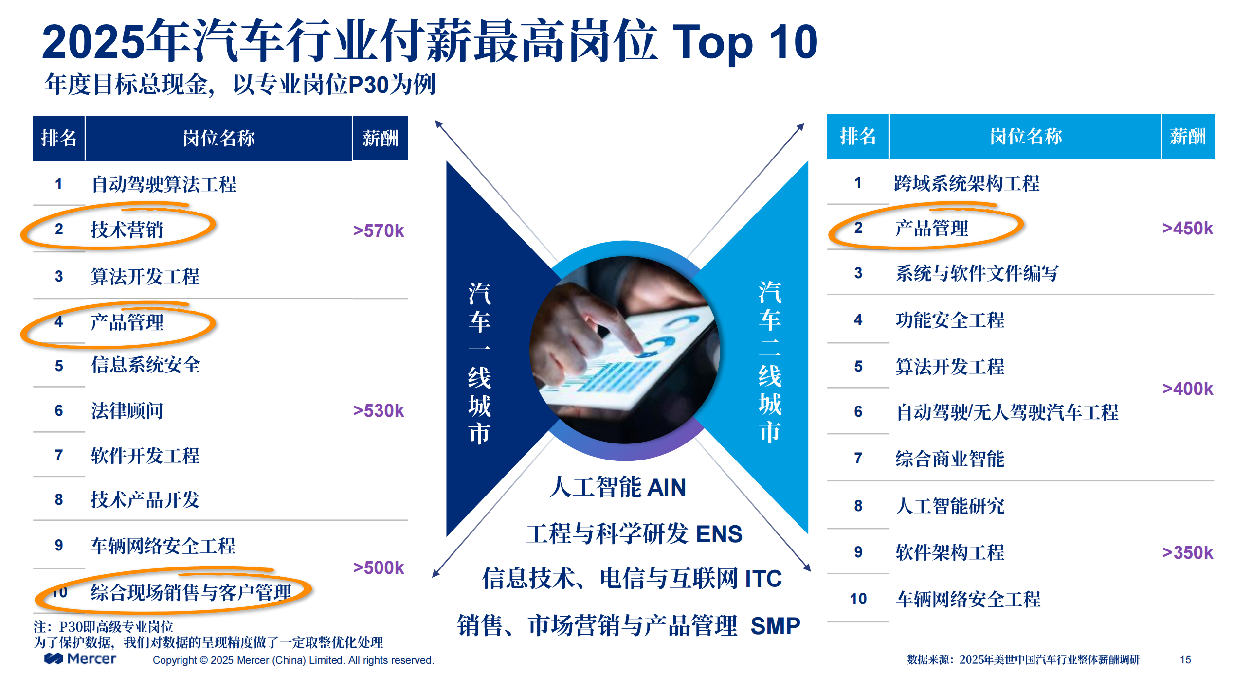 调查报告显示,在智能驾驶时代,汽车企业对AI人才更看重,他们的薪资也排在前列。