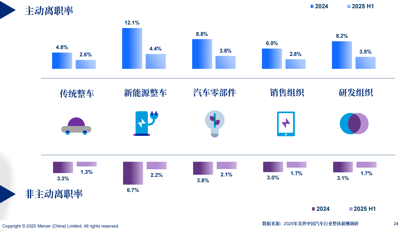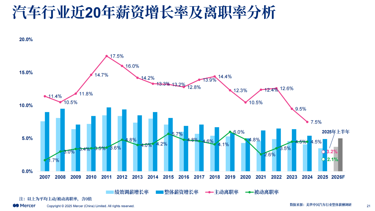 汽车行业人才流动比较频繁,报告列出了2025年薪资增长与离职率的关系。