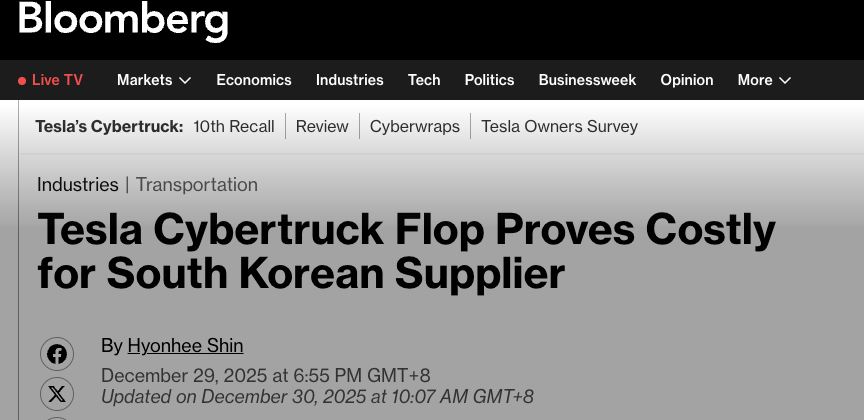 12月30日消息,据彭博社报道,近日有知情人士透露,特斯拉一家供应商最终交付的电池材料量,与这家车企近三年前订单量相比,仅有极小一部分,其中部分缘由和 Cybertruck 存在的问题紧密相关。
