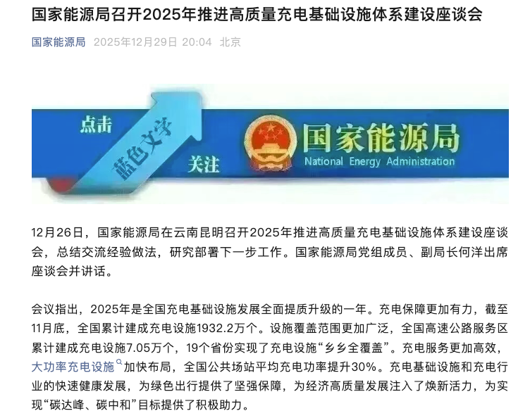 12月30日消息,据国家能源局官方消息显示,2025年是全国充电基础设施发展全面提质升级的一年。充电保障更加有力,截至11月底,全国累计建成充电设施1932.2万个。设施覆盖范围更加广泛,全国高速公路服务区累计建成充电设施7.05万个,19个省份实现了充电设施“乡乡全覆盖”。