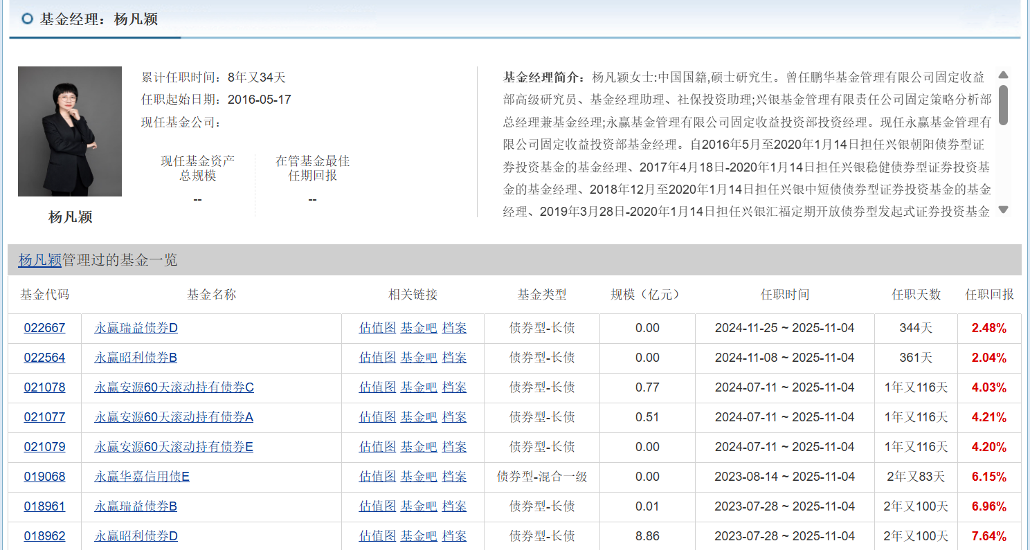 就在业绩高歌猛进的2025年11月,永赢基金连发多则公告,宣布固定收益投资部投资副总监杨凡颖因个人原因卸任旗下全部8只产品。这位管理规模超120亿元、代表作年化回报稳居同类前列的固收“压舱石”,一夜之间在管规模归零。