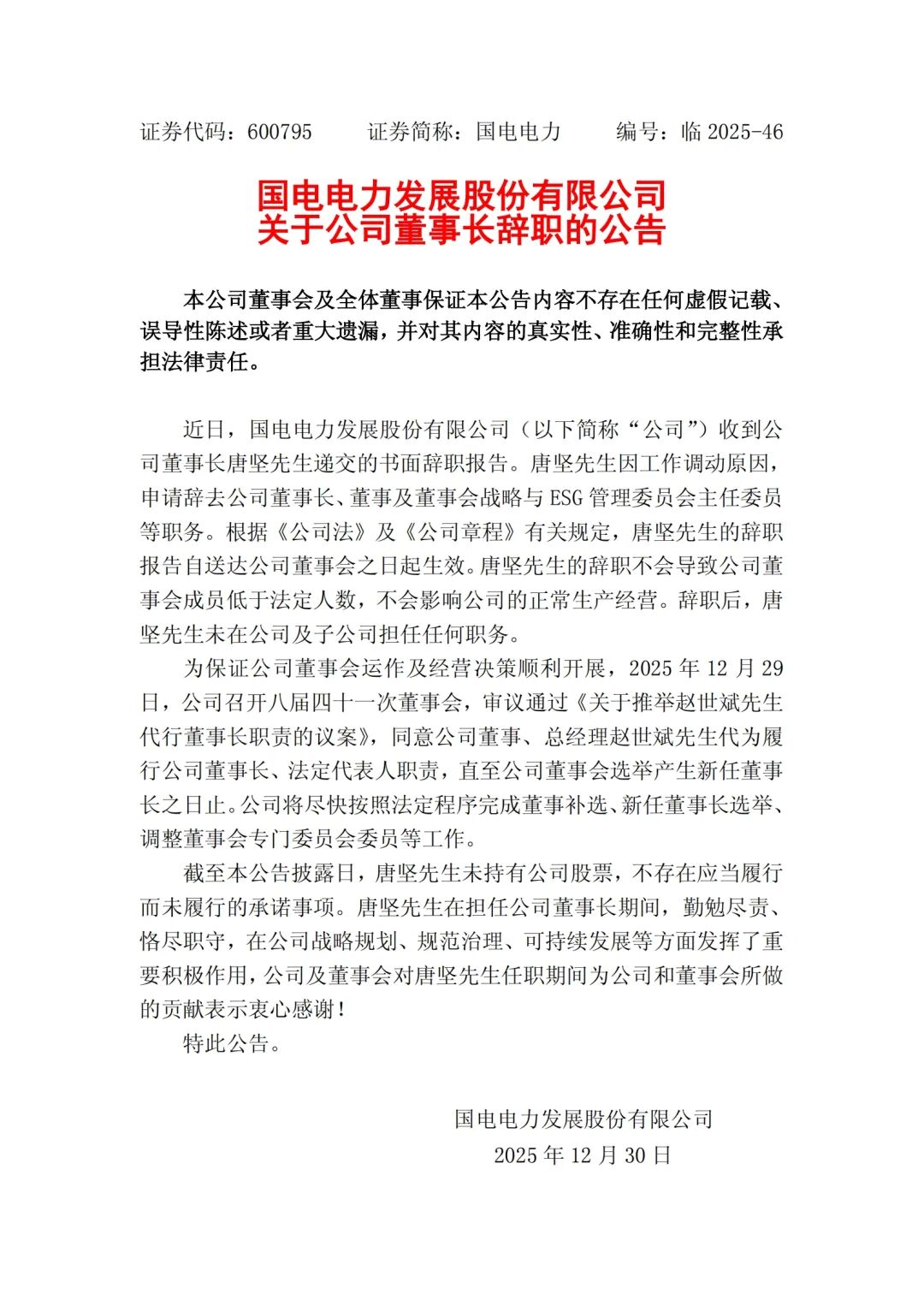 12月29日,国电电力发布公告,近日,国电电力发展股份有限公司收到公司董事长唐坚先生递交的书面辞职报告。唐坚先生因工作调动原因,申请辞去公司董事长、董事及董事会战略与ESG管理委员会主任委员等职务。辞职后,唐坚先生未在公司及子公司担任任何职务。