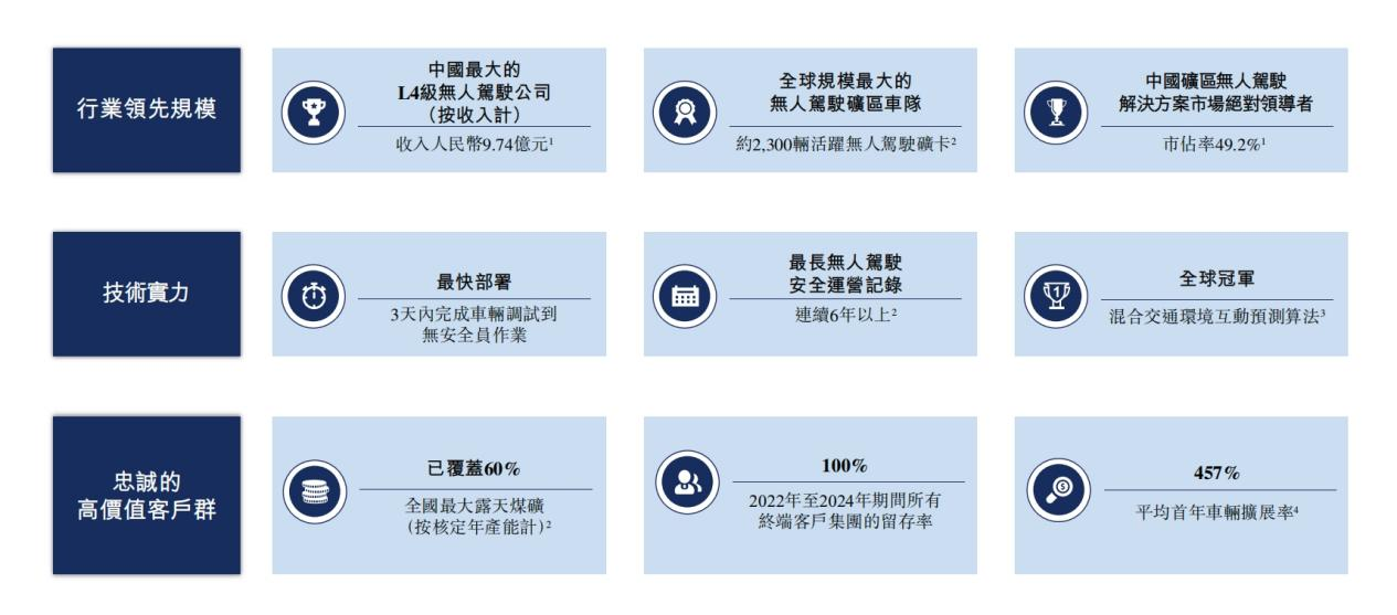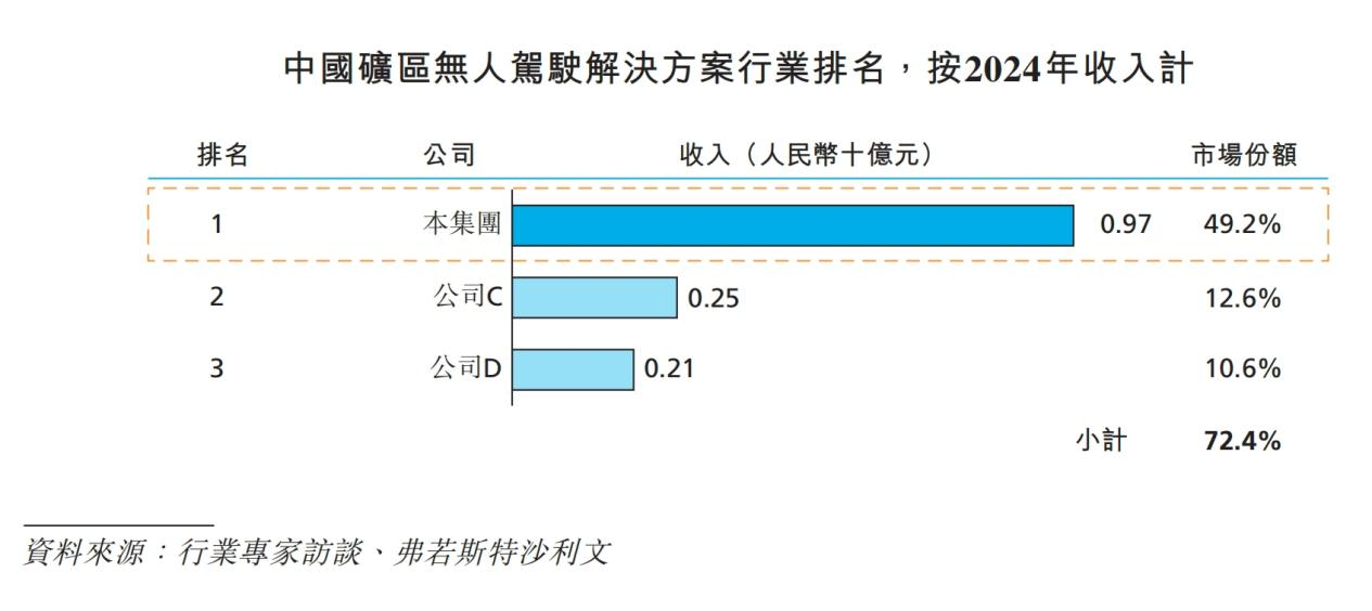 2024年,公司实现总收入9.86亿元,在中国所有L4级无人驾驶公司中排名第一;同时,公司是中国最大的矿区无人驾驶解决方案提供商,在该市场份额约为 49.2%;而按同期收入计,中国作为全球最大的L4级矿区无人驾驶解决方案市场,其全球市占率超过40.5%。