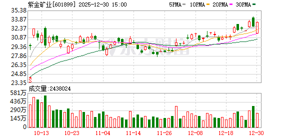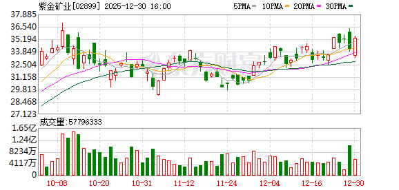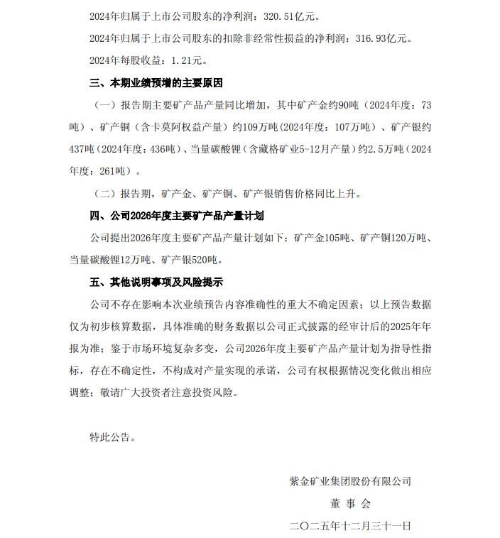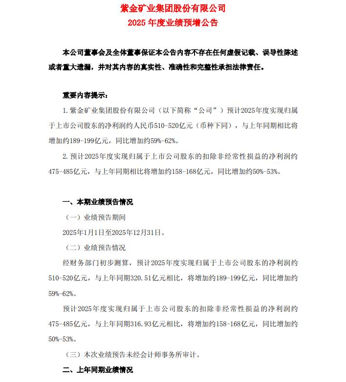 12月30日,紫金矿业(601899.SH)公告称,紫金矿业预计2025年度归属于上市公司股东的净利润约510亿元-520亿元,同比增加约59%-62%。报告期内,主要矿产品产量同比增长,其中矿产金、矿产铜、矿产银产量及销售价格上升,当量碳酸锂产量大幅增长,推动公司盈利显著提升。