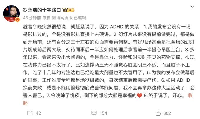 结束后罗永浩专程发了微博解释,并表示如果ADHD的情况得不到改善,他之后不会再举办这种大型活动了。