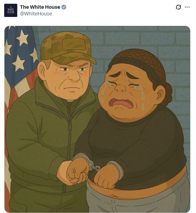 这股潮流中最荒诞的时刻出现在白宫官方X账号——一张经过吉卜力滤镜处理的照片,画面中是一名哭泣着被捕的涉毒罪犯。
