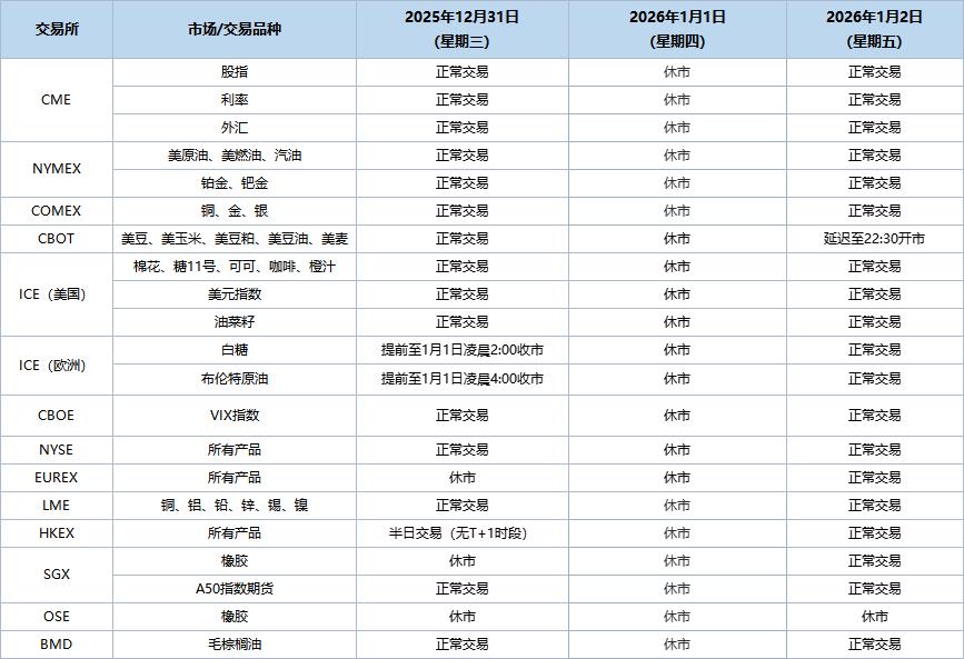 今日将公布德国11月实际零售销售月率、德国11月实际零售销售年率、瑞士11月官方储备资产、美国截至12月22日当周初请失业金人数、美国截至12月22日当周续请失业金人数等数据。此外,需要注意的是:美联储公布货币政策会议纪要。12月31日,洲际交易所(ICE)因元旦前最后一个交易日旗下布伦特原油期货合约交易提前于北京时间1日04:00结束;伦敦证券交易所因元旦前夕提前于北京时间20:30收市;香港交易所因元旦前夕交易半日,12时08分与12时10分之间随机收市;芝商所(CME)旗下美债期货合约交易于北京时间15:00开始,提前于北京时间1日03:30结束;上金所、上期所、郑商所、大商所12月31日因元旦前夕无夜盘交易。