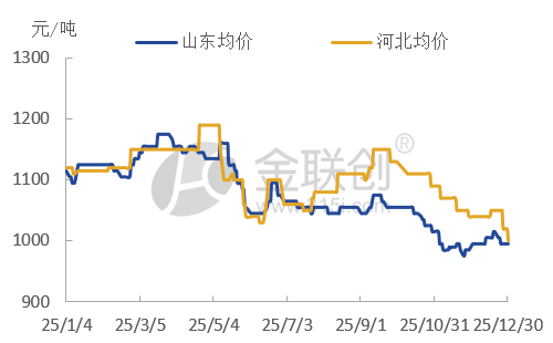 截至12月30日,山东甲醛在995元/吨左右,月内原料甲醇价格重心上移,甲醛成本端压力持续提升,但需求缺乏提振,价格震荡整理;河北地区在1000元/吨左右,区域内冬季环保管控趋严,下游板材行业停工较多,需求上有明显的削减,即使在成本坚挺支撑下,需求面疲软仍致使价格下行。