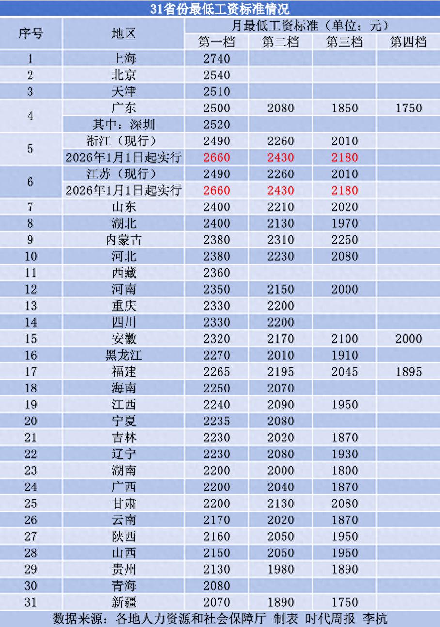同处长三角的江苏和浙江,均在近日发布通知调整各自的全省最低工资标准。调整后,两地的三档工资标准均分别为2660元、2430元、2180元。