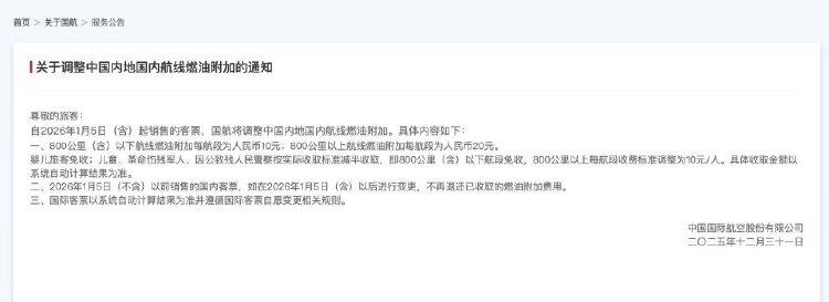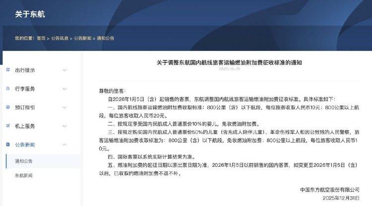 2025年12月31日,东方航空、南方航空和中国国际航空先后发布通知,自2026年1月5日(含)起销售的客票,调整国内航线旅客运输燃油附加费征收标准。具体如下:
