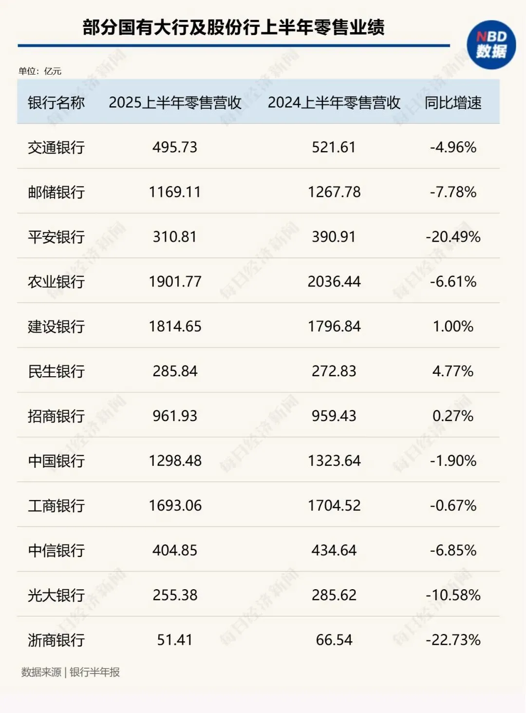尽管工商银行与中信银行的零售利润均实现同比大幅增长,但主要是因2024年同期利润基数较低,以工行为例,其2024年上半年零售利润总额相较2023年同期下降超30%。