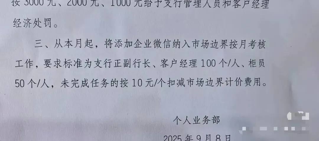 也有银行按人头“计价”,“我们要求用企微把贵宾客户都添加上,少一个扣50元,我刚转岗被分了600多位贵宾客户。”有银行员工称。