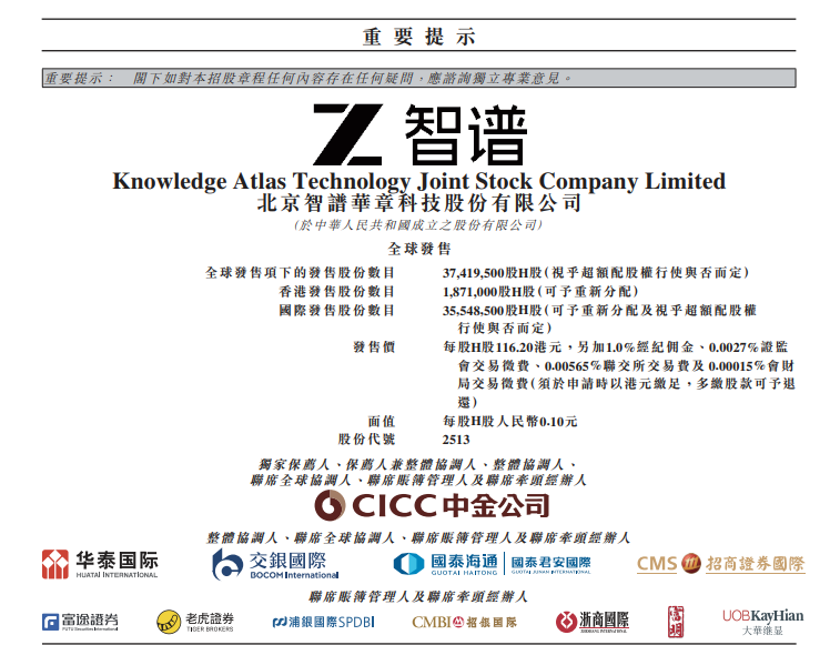 作为国内首家冲刺“大模型第一股”的企业,北京智谱华章科技股份有限公司(下称“智谱”)开启全球招股,预计2026年1月5日结束,并计划于2026年1月8日正式以“2513”为股票代码在港交所主板挂牌上市。智谱此次发行定价116.20港元/股,发行3741.95万股,本次IPO募资总额预计将达43亿港元,IPO市值预计超511亿港元。