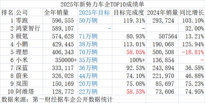 随着12月份结束,新势力也交出了2025年的年度成绩单,总体而言,只有零跑、小米和小鹏三个品牌完成了全年的销量目标。