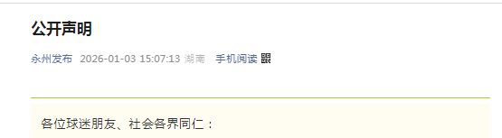 1月3日,永州发布发布公开声明,落款是永州市足球协会和“湘超”永州市队。声明称,在我市足球发展历程中,我们共同见证了一个振奋人心的时刻——永州足球队团结拼搏,勇夺湖南足球联赛冠军!这份来之不易的荣誉,属于每一位挥洒汗水的运动员、教练员,属于所有默默支持永州足球事业的你们。在此,永州市足球协会、“湘超”永州市队向长期以来关心、帮助我市足球运动发展的各界朋友,致以最衷心的感谢!