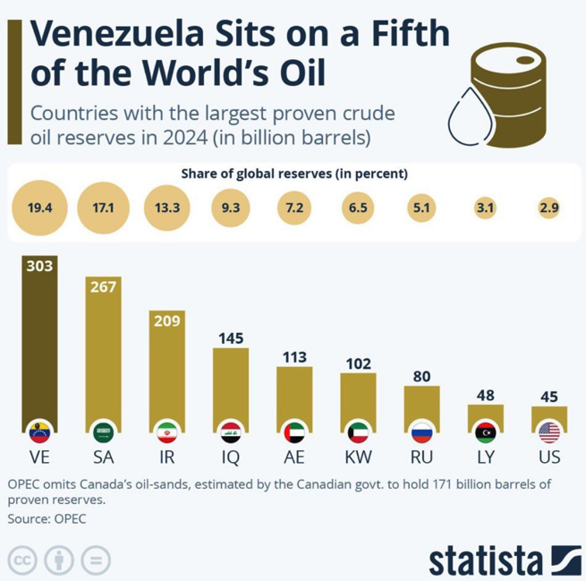 作为背景,据Statista统计,委内瑞拉有约3000多亿桶的石油储备,占该资源全球总量的近五分之一。委内瑞拉的石油储量不仅多于石油王国沙特,还差不多能达到美国的6.7倍。