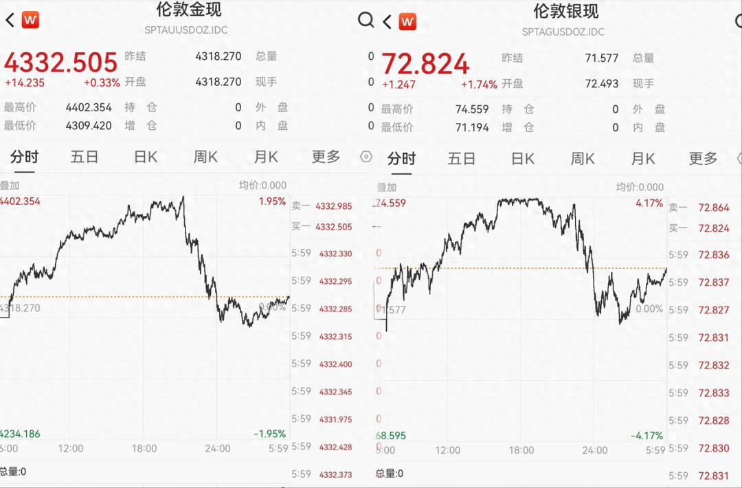 Wind数据显示,现货黄金一度涨近2%,突破4400美元/盎司,收盘报4332.505美元/盎司,涨0.33%。现货白银日内涨幅一度扩大至4.17%,触及74美元/盎司,收盘报72.824美元/盎司,涨1.74%。此外,现货铂金、现货钯金纷纷走高,涨超3%与1.5%。