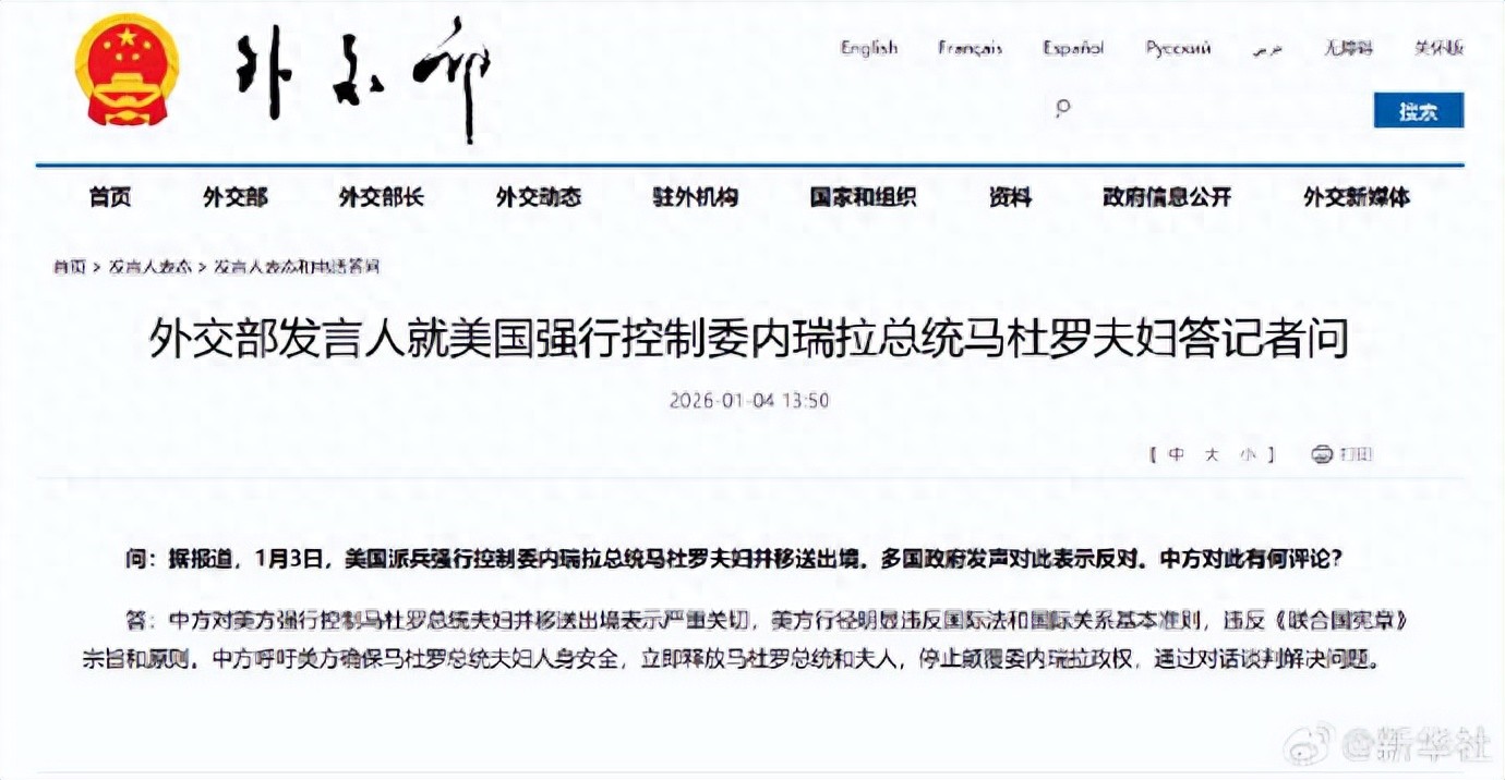 外交部发言人就美国强行控制委内瑞拉总统马杜罗夫妇答记者问。