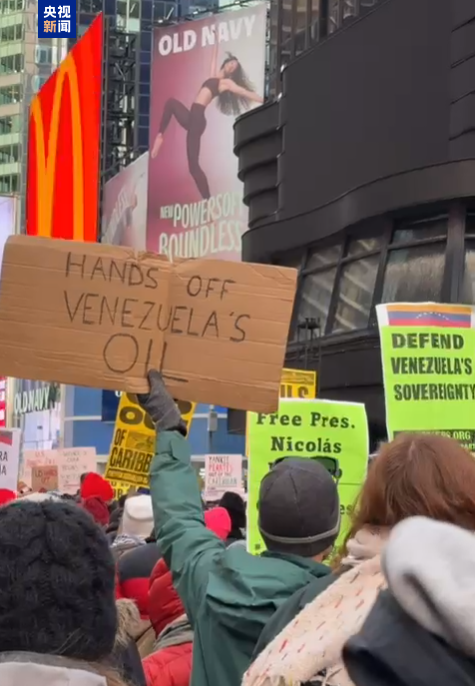 在纽约 ,人们聚集在时代广场的美国陆军征兵办公室外,手持反对对委内瑞拉开战的标语。