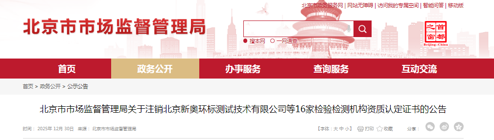 据北京市市场监督管理局网站消息,近日,北京市市场监督管理局发布关于注销北京新奥环标测试技术有限公司等16家检验检测机构资质认定证书的公告。