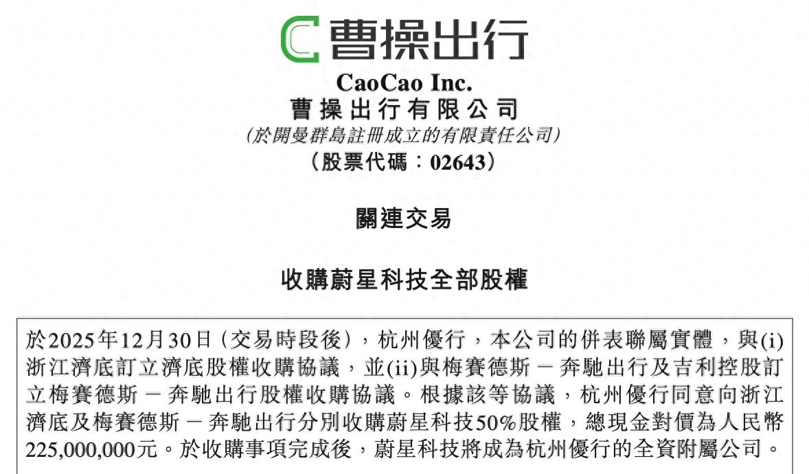 12月30日晚,曹操出行(02643.HK)发布公告,宣布两项战略收购。公司计划全资收购蔚星科技(下称:耀出行),并拟全资收购吉利商旅。两项交易完成后,耀出行与吉利商旅均将成为曹操出行的全资附属公司。