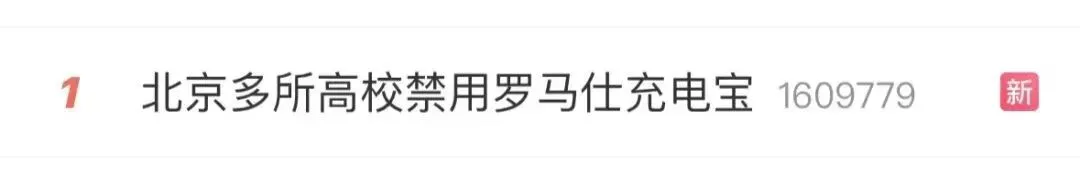事件发酵后,“北京多所高校禁用罗马仕充电宝”词条迅速冲上热搜第一。