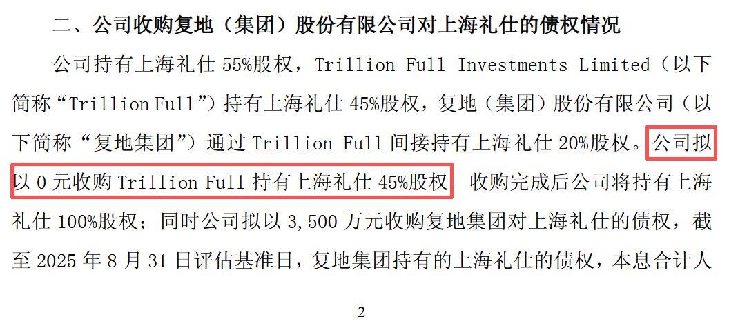 2025年12月,京投发展股份有限公司董事会公开发布的一则公告显示,该公司持有上海礼仕酒店有限公司(以下简称“上海礼仕”)55%股权,拟收购Trillion Full持有的上海礼仕另外45%股权,收购完成后,公司将持有上海礼仕100%股权。据公告称,该公司拟以0元完成此次收购。